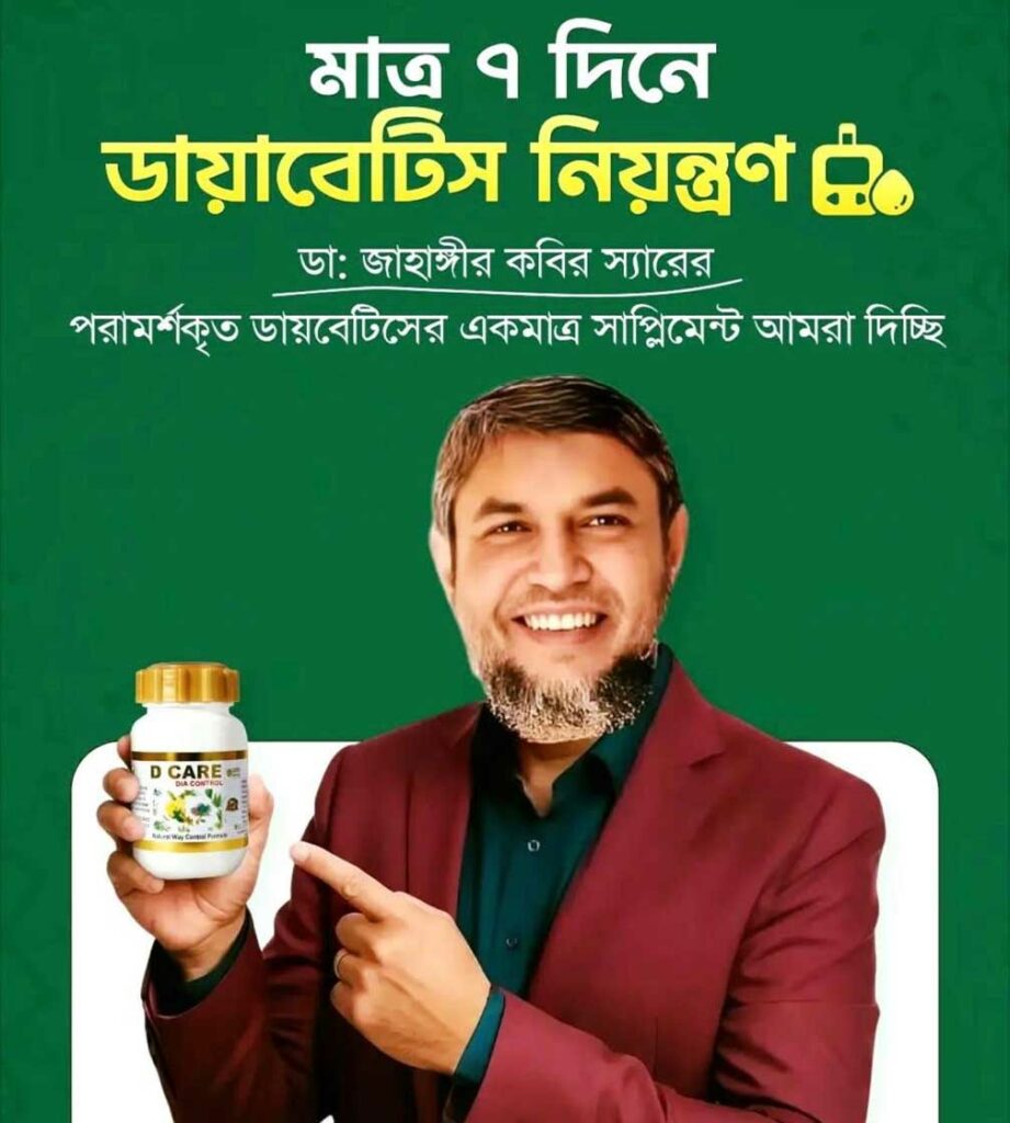 লাখ লাখ টাকা ঔষধ ও ইনসুলিনের জন্য খরচ না করে মাত্র 7 থেকে 15 দিন ডি-কেয়ার সেবনে আপনার ডায়াবেটিস নিয়ন্ত্রণ করবে এবং আপনি সম্পূর্ণ সুস্থ হবেন ইনশাল্লাহ ।